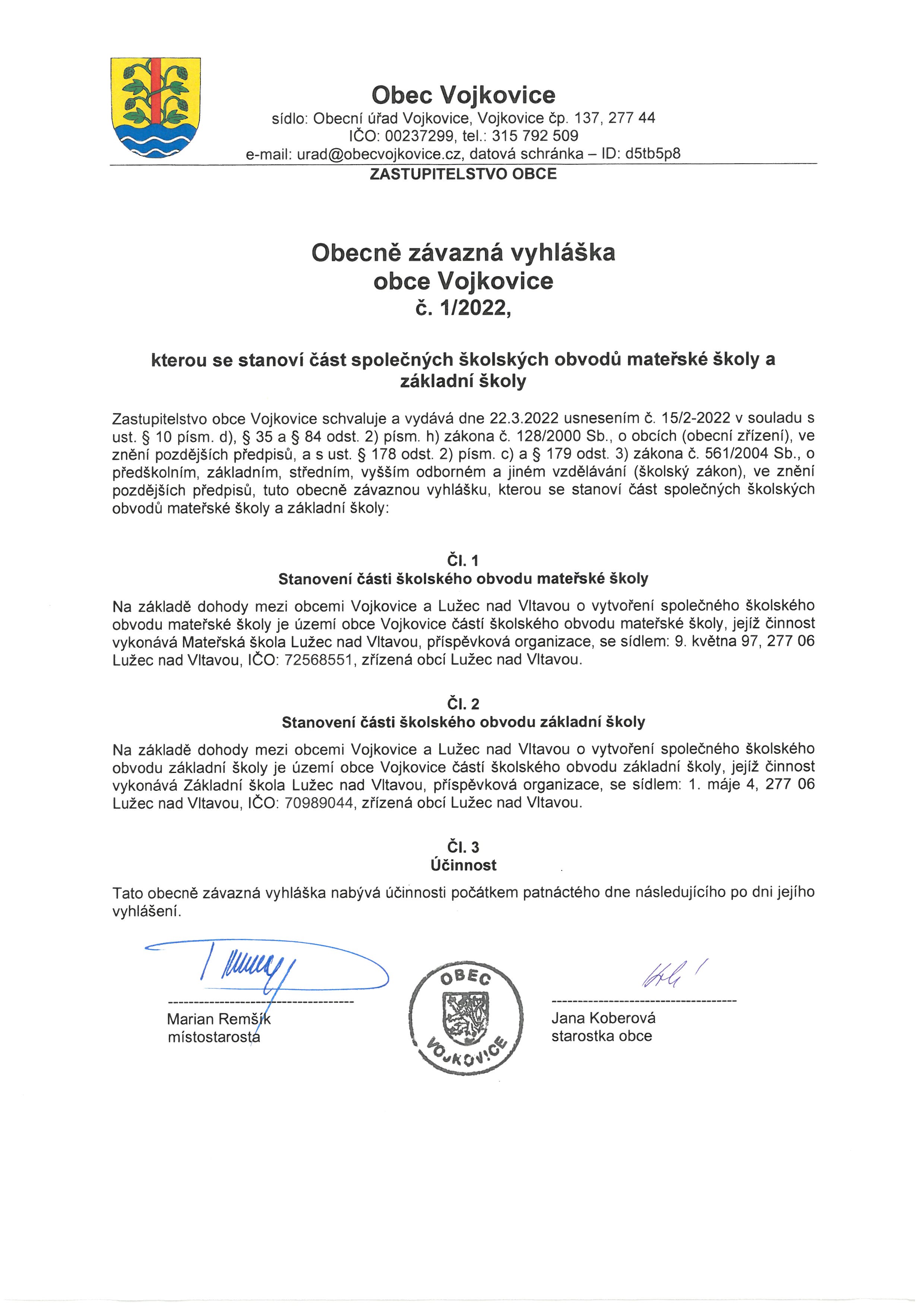 Obecně závazná vyhláška obce Vojkovice č. 1/2022, kterou se stanoví část společných školských obvodů mateřské školy a základní školy - verze 3